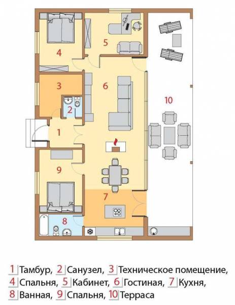 внутреннюю территорию участка, на которой зона отдыха продолжается просторной террасой, имеющей площадь более 40 м2. По бокам от неё расположены барбекю и подсобное помещение для уличной мебели и инвентаря. Заглубленную в конструкцию здания террасу, как и все окна, можно закрыть при помощи противовзломных роллет. Явственно ощущается, что и планировка помещений, и выбор дизайнерских решений были подчинены желанию сделать жизнь хозяев дома наиболее комфортной и здоровой. Потолки выполнены из деревянных досок, имитирующих брус. Поверх теплого пола уложена керамическая плитка. В обоих санузлах стены также отделаны плиткой, а в жилых комнатах они обшиты деревом или оклеены бумажными обоями.