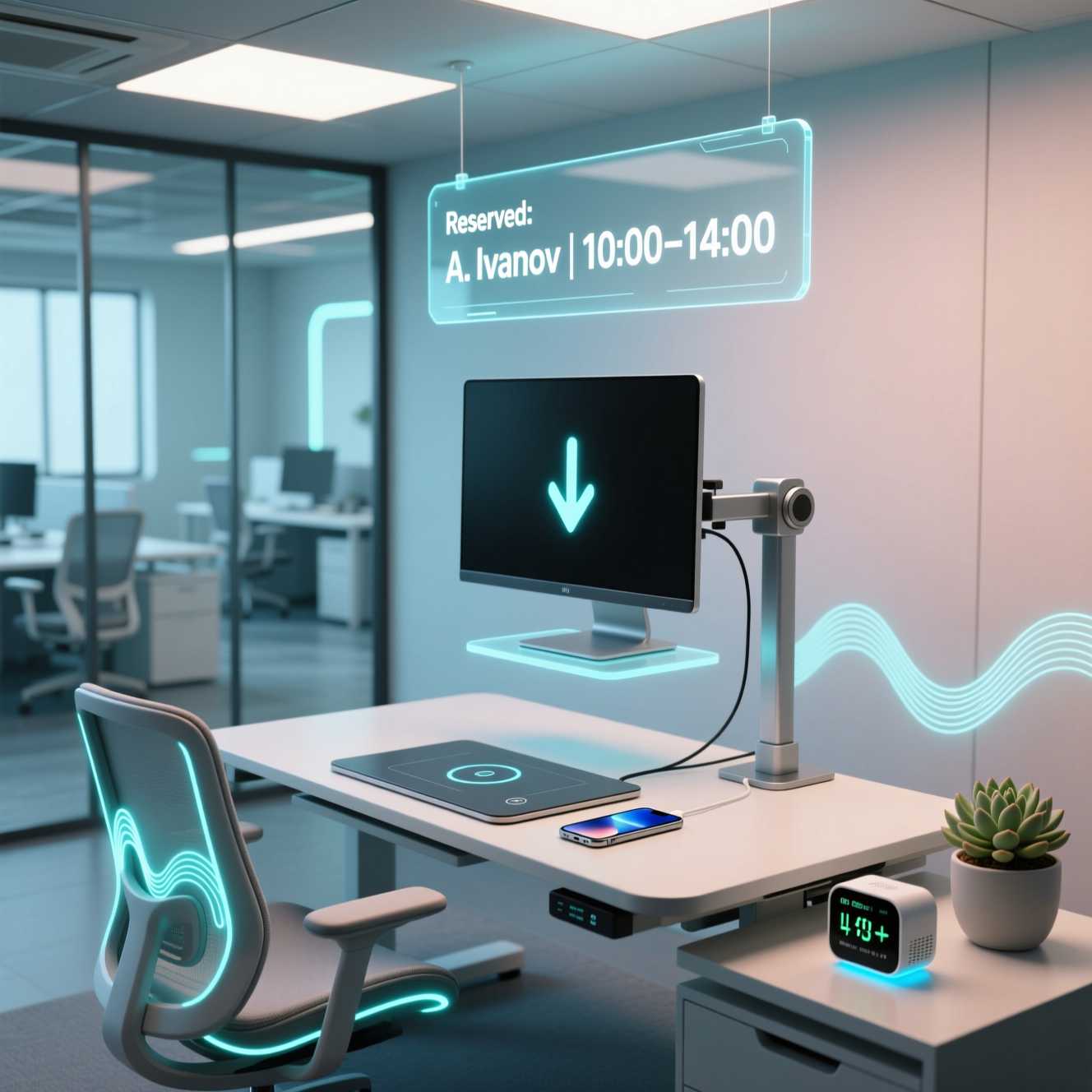 Эти столы оснащены датчиками, которые в реальном времени собирают данные по occupancy, температуре, влажности, уровню CO2 и шуму, интегрируя их в централизованную платформу, такую как Cisco Spaces, для анализа и оптимизации. Умная мебель включает в себя встроенные розетки, USB-порты, беспроводную зарядку, датчики присутствия и возможность адаптации под пользователя.