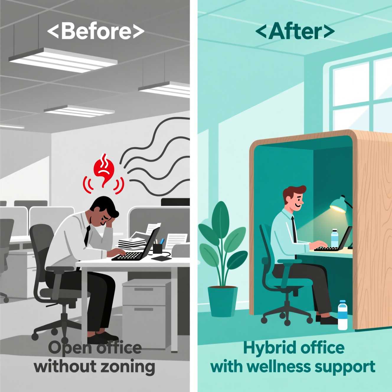 | Освещение | Недостаток света снижает концентрацию. Холодный свет (5000–7000 К) повышает бдительность и продуктивность, тёплый (2700–3000 К) способствует расслаблению. Циркадное освещение может повысить продуктивность на 12%. (источник) | Максимизировать естественный свет, использовать циркадное освещение, обеспечить уровень освещённости не менее 500 лк на рабочей поверхности, дать сотрудникам персональный контроль над освещением. |