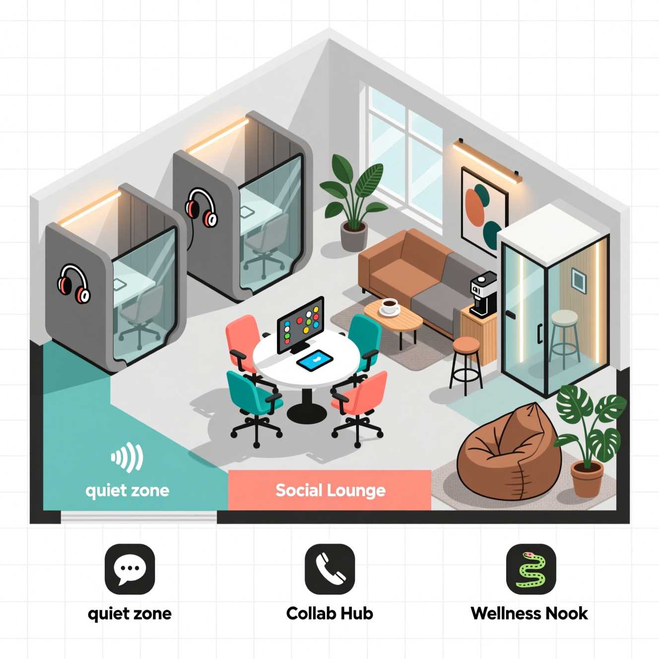 Ключевым элементом является зонирование, которое включает не менее 22 типов гибких рабочих зон, от открытых пространств и зон для неформального общения до тихих комнат, телефонных кабинок, комнат для благополучия и даже спальных капсул. Эта дифференциация позволяет сотрудникам выбирать оптимальное место для конкретной деятельности: сосредоточенной работы, интенсивной коллаборации, приватного разговора или отдыха.